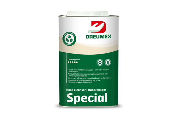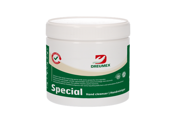 Dreumex Special is een oplosmiddelvrije handreinigingspasta die gebruikt kan worden voor middelzware tot zware vervuilingen zoals smeermiddelen, diesel, remvloeistof, cement en roest. De pasta is met name geschikt voor gebruik in de autoindustrie, de bouw en metaalbewerkende industrie.
