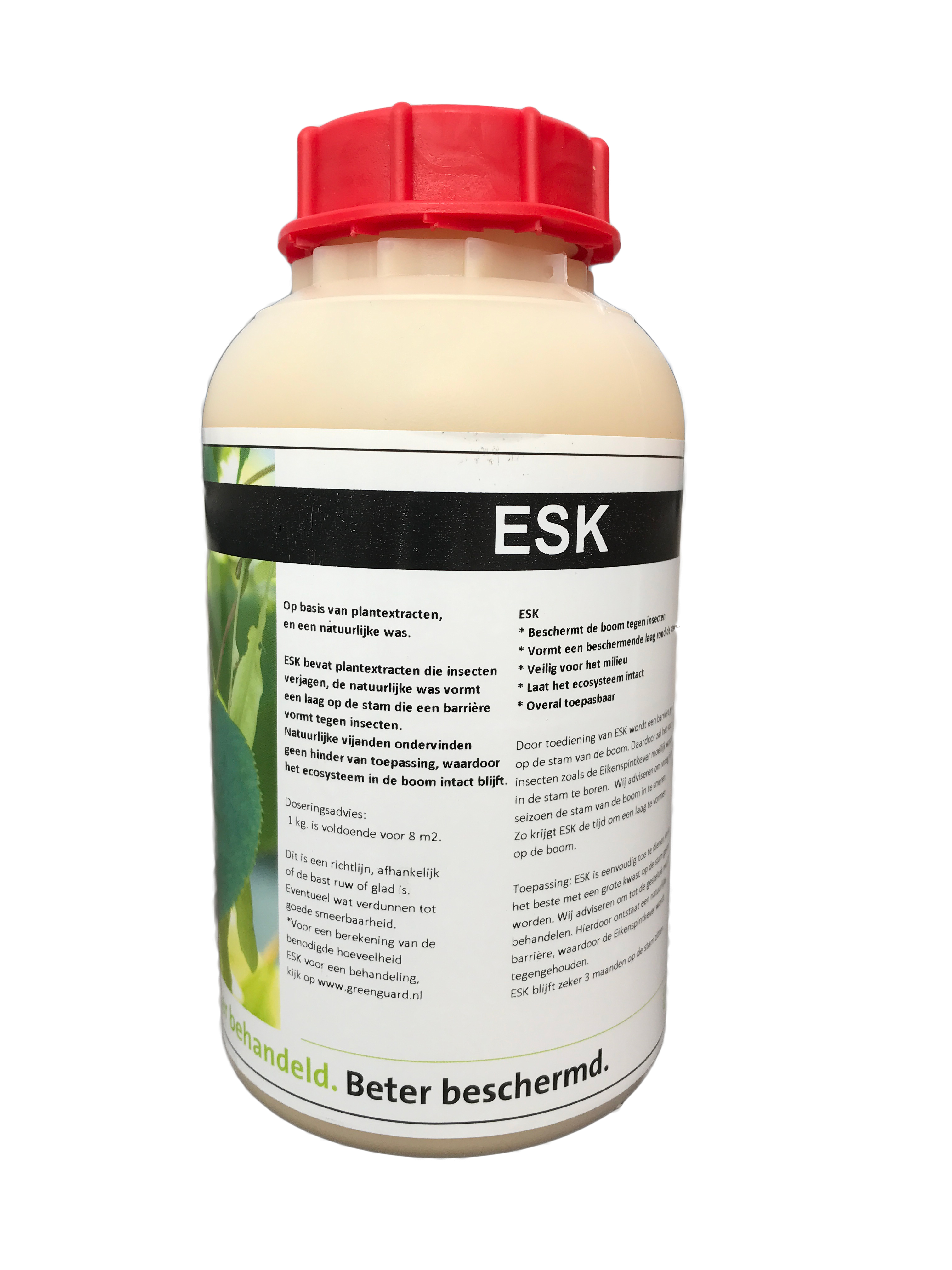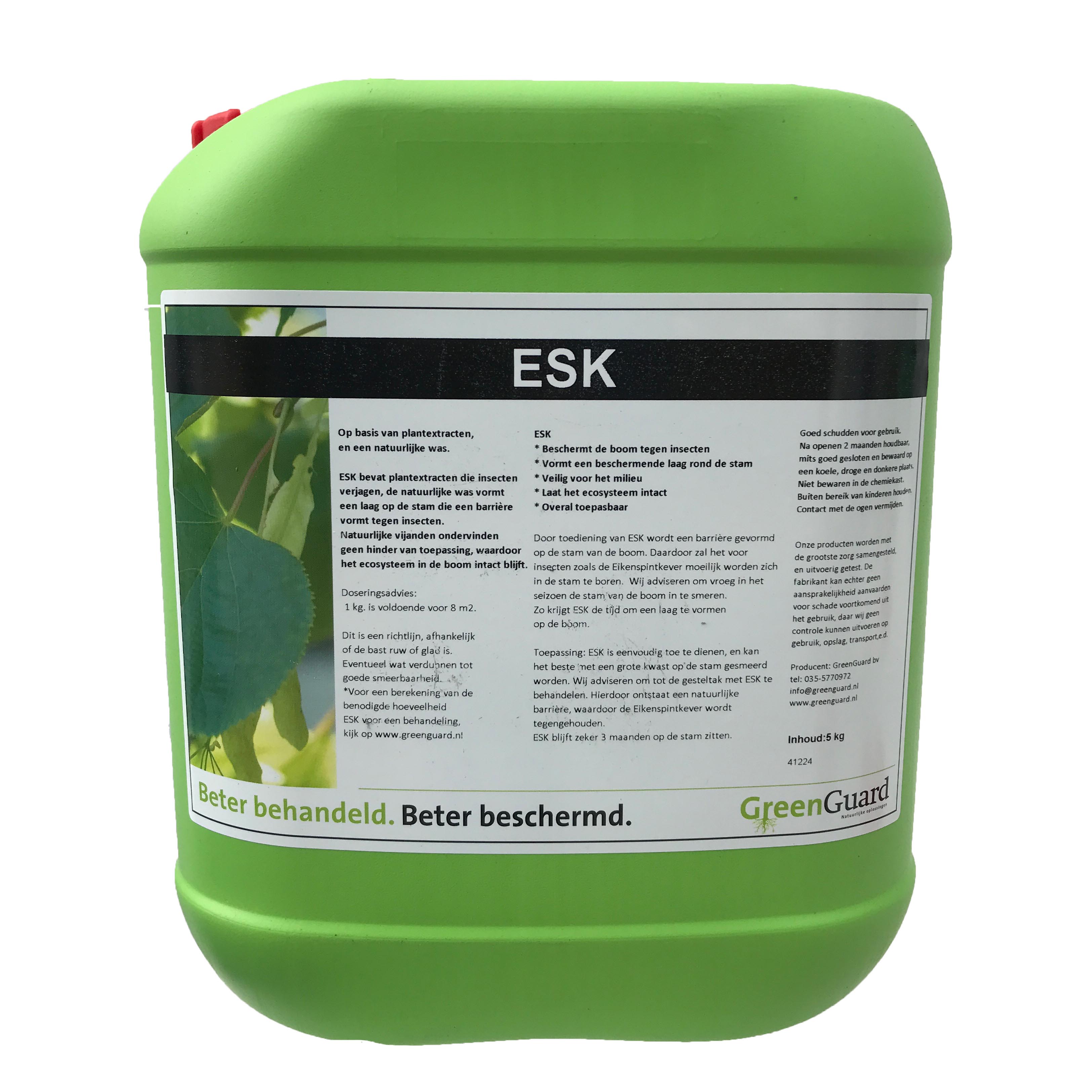 ESK is een natuurlijk afdekmiddel waarmee eiken in de aanslagperiode beter beschermd worden. Het product is samengesteld uit diverse plantextracten en gebonden met een natuurlijke lijmsoort. Door met ESK de stam af te dekken, helpt u de boom een stressvolle- en/of aanslagperiode door en bevordert u een gezonde groei.