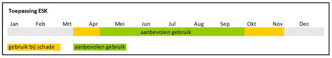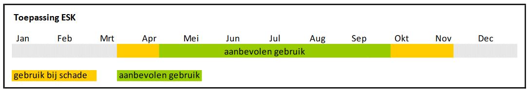 Voor het aanbrengen van de extra buitenschil met ESK kunt u het beste een grote (wit)kwast gebruiken. Hiermee kunt u goed de onregelmatigheden van de bast mee behandelen en wordt de hele oppervlakte van de stam goed bedekt, wat effectiever is. Bedek de stam tot de gesteltak en dek ook de takoksels goed af met ESK. Met deze bekleding ontstaat er een natuurlijke barrière. Een andere methode is om de ESK op jute aan te brengen om vervolgens rond de stam te wikkelen en aan te drukken met de (wit)kwast. ESK blijft zeker 2 maanden op de stam zitten, afhankelijk van de weersomstandigheden. Het is belangrijk om op tijd de stam met ESK te behandelen.