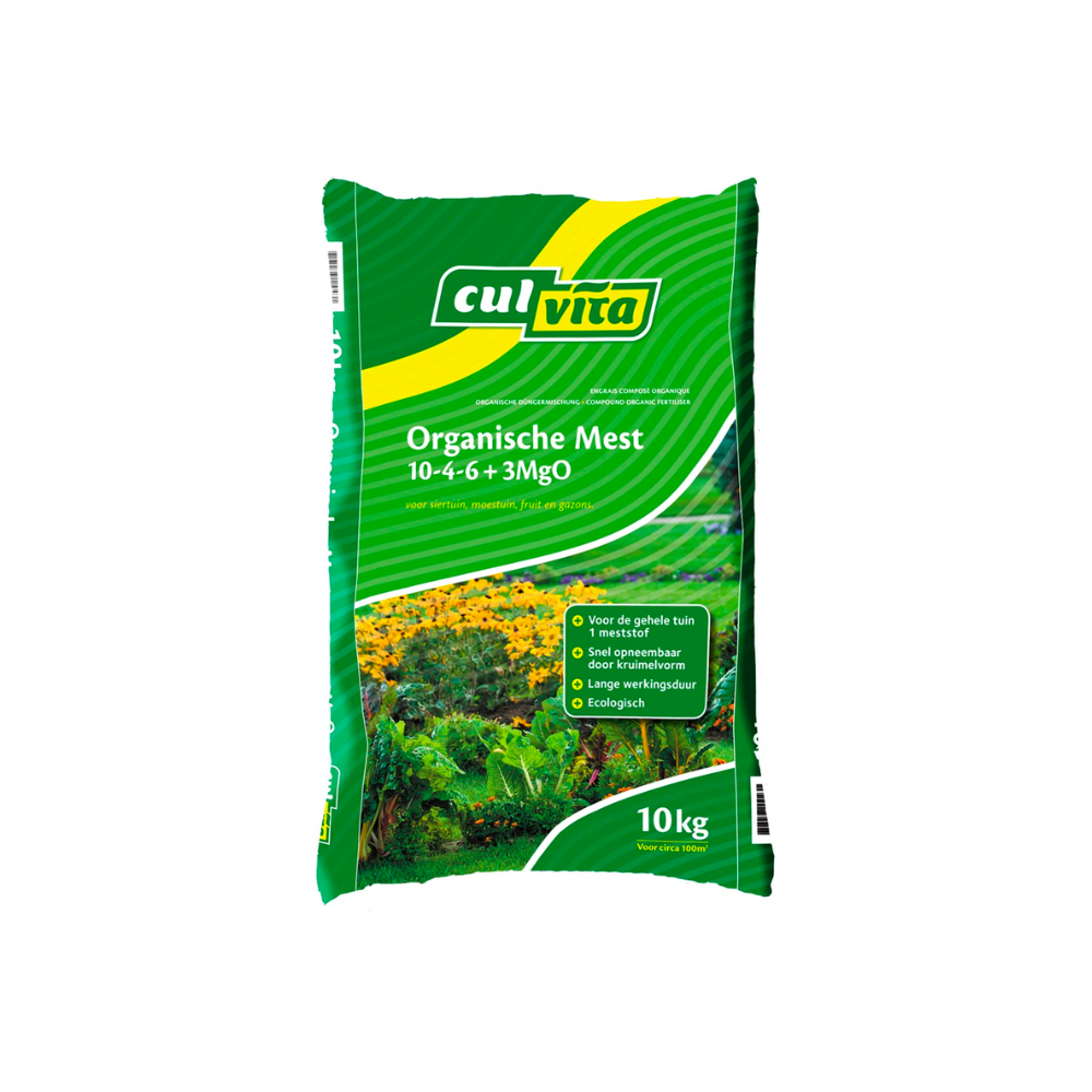 Culvita Organische Mest bevat eiwitrijke grondstoffen. Deze eiwitten worden door het bacterieleven in de grond omgezet in verantwoorde, goed opneembare voedingsstoffen die geleidelijk vrijkomen. Deze voedingswijze zorgt voor geleidelijke groei. De Culvita Organische Mest is verder verrijkt met 3% Magnesium wat zorgt voor een nog mooiere diepgroene kleur voor de planten en het gazon. Culvita Organische Mest heeft een werkingsduur van ca. 3 tot 4 maanden en staat garant voor een hoge opbrengst.