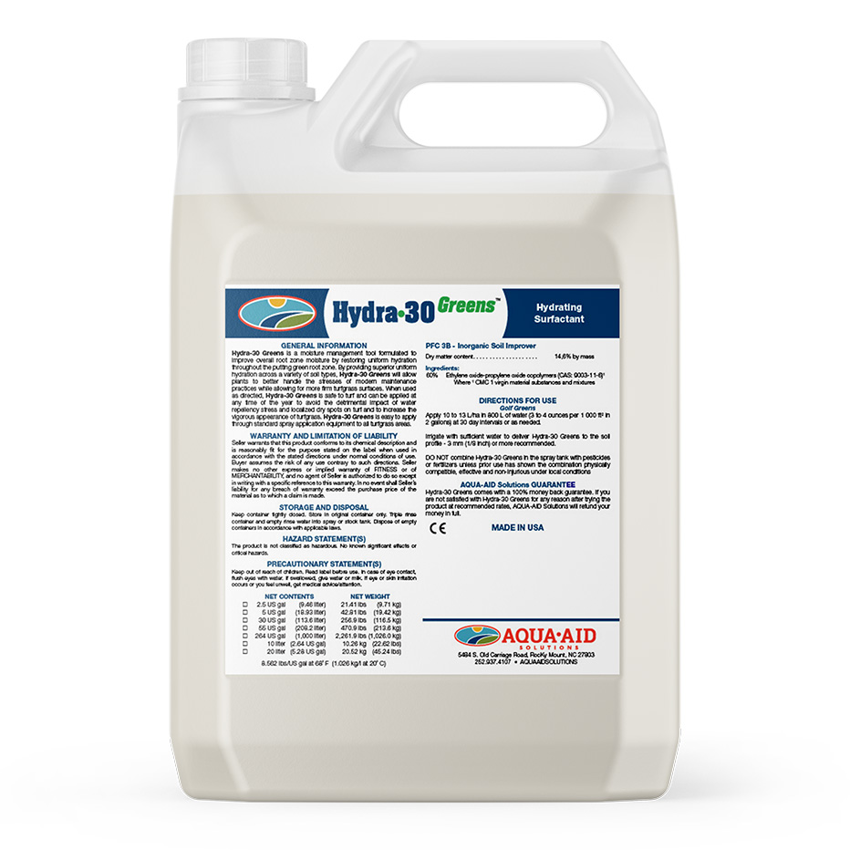 Aqua Aid Hydra 30 Greens is een gepatenteerde, biologisch afbreekbare bevochtiger die zorgt voor snelle infiltratie en diepe bodemhydratatie. Het product verdeelt vocht gelijkmatig over verschillende bodemprofielen, waardoor de grasmat consistent presteert en een stevig(er) speeloppervlak behoudt.