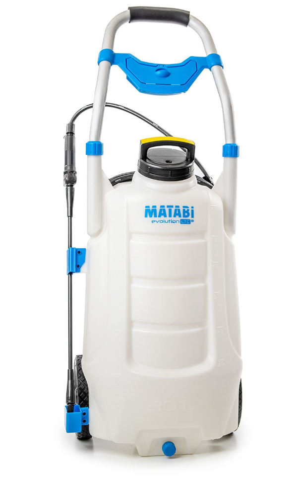 Spuitwagen van 30 liter uitgerust met pomp en sproeiers voor behandelingen met fytosanitaire producten (herbiciden en fungiciden), anti-muggentoepassingen, vloeibare meststoffen, producten van natuurlijke oorsprong, enz.