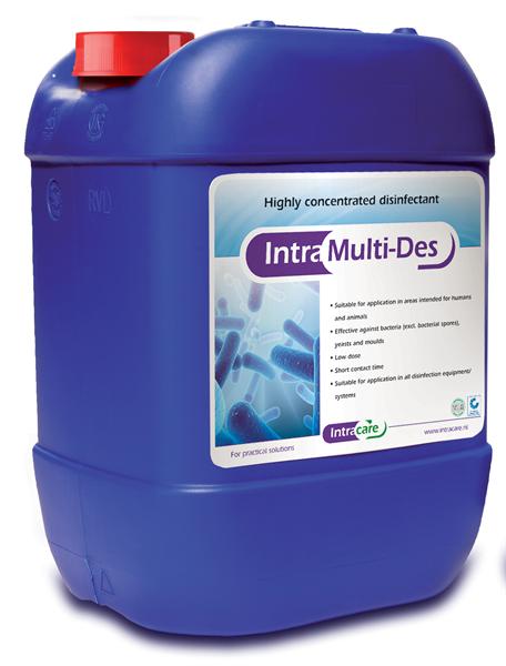 Intra Multi-Des GA is een sterk desinfectiemiddel, gebaseerd op quaternaire ammonium complex, aldehyden en tensiden. Het is uitsluitend toegestaan als middel ter bestrijding van bacteriën (exclusief bacteriesporen), gisten en schimmels, in ruimten bestemd voor het verblijf van mensen.