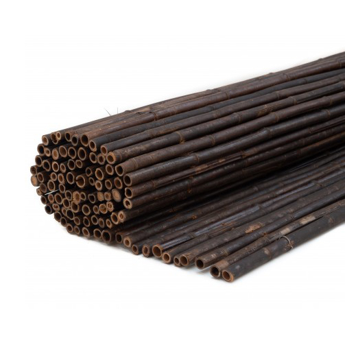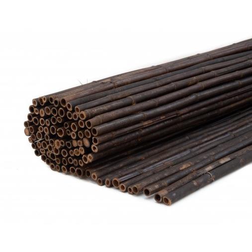 De bamboe stokken hebben hun donkere kleuren van nature en zijn dus niet geverfd. Bij dit bamboescherm zijn de stokken doorboord en samengebonden met gegalvaniseerd ijzerdraad. De draad loopt door de stokken heen en is dus zo goed als niet zichtbaar. Wordt geleverd op een rol met een breedte van 180 cm, verkrijgbaar met een hoogte van 150, 180 en 200 cm.