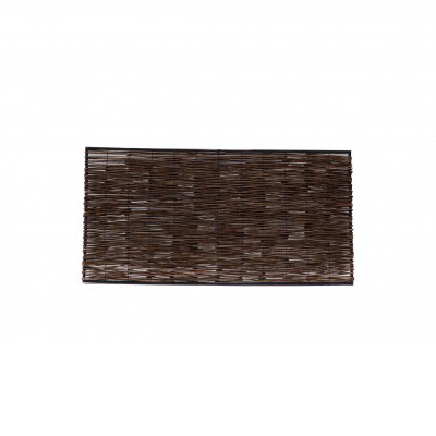 Gevlochten wilgenmat of wilgentenenscherm op een zwart gecoat stalen frame. De wilgentenen hebben een dikte van ongeveer 10 mm, het stalen buisframe heeft een dikte van 15 mm. Bij dit wilgenscherm zijn de takken gevlochten tussen stalen staven die eveneens zwart gecoat zijn.